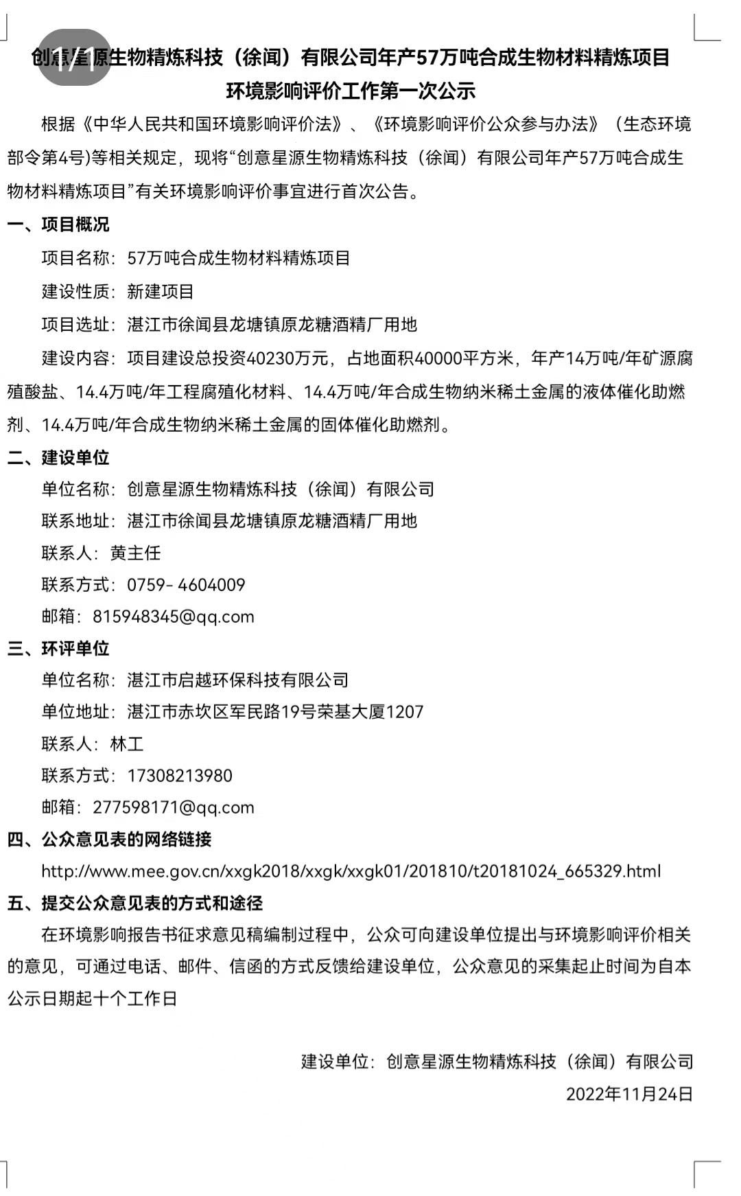 創意星源(徐聞)合成生物材料精煉項目環評公示